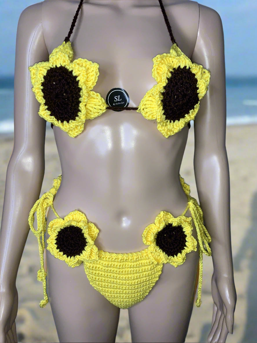 Turn heads and soak up the sun in our handmade Crochet Sunflower Bikini, designed with vibrant sunflower details and crafted from 100% soft acrylic yarn. Each set is made to order, ensuring a custom fit that hugs your body comfortably and beautifully.